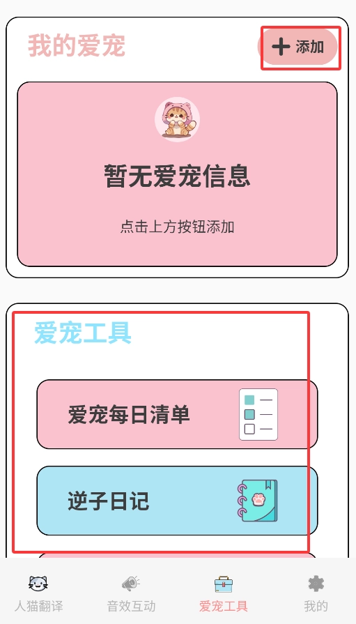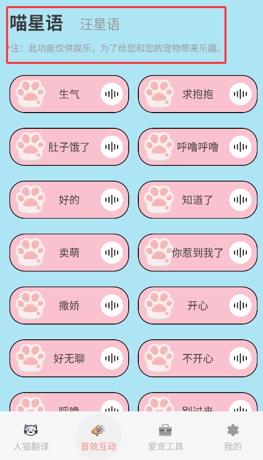 3、趣味互动专区设有猫语和狗语模拟功能,能播放不同情绪的动物叫声,方便与宠物进行交流。