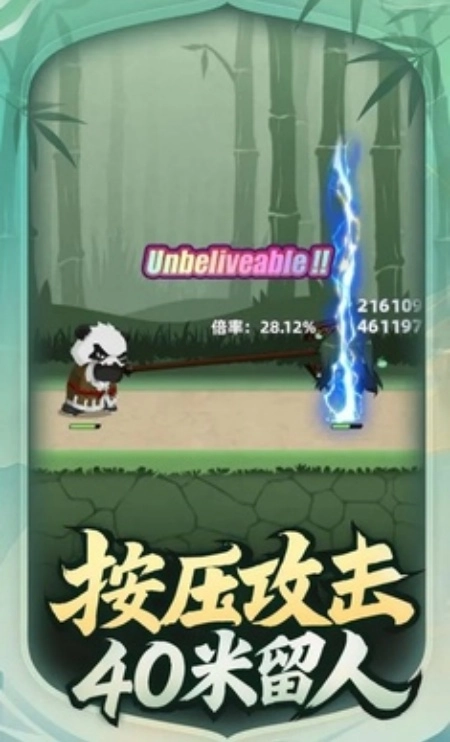 《让你先跑40米》安卓版是一款魔性满满的休闲战斗游戏,玩家将化身手持巨斧的熊猫大侠——按住屏幕时斧头会疯狂伸长,精准判断距离后松手,就能劈向怪物。免费版中,玩家需依靠自身技巧与策略,找准攻击时机,体验用长斧击败怪物的乐趣,畅享独特的战斗快感。游戏前期的按压攻击方式借鉴了《跳一跳》《棍子英雄》等作品,后期则融入了回合制元素:当玩家的武器精通达到一定等级,便可解锁自动战斗的回合制模式。