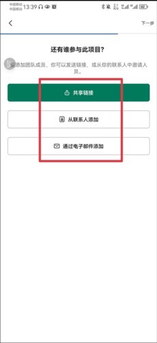 4、创建完成后,你既能够把链接发送给团队成员,也可以从联系人处添加,或者通过电子邮件进行添加。