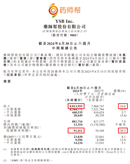 2024年上半年,药师帮达成营收与利润双双增长的“高质量增长”态势。相关报告表明,其净利润超过1300万元,从大幅亏损状态首次转变为盈利;经调整后的净利润超9100万元,与去年同期相比大幅增长30.3% 。