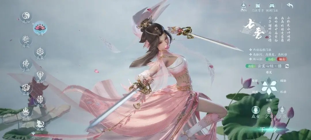 在选择技能的环节,每个心法在移动端仅需操作6个门派技能按键与4个轻功技能按键,相较于PC端的操作数量要少不少。