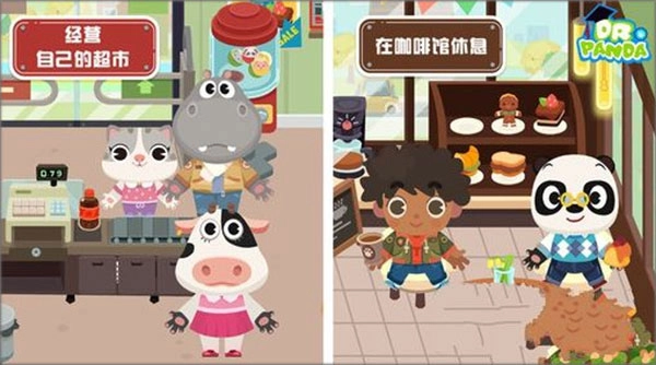 熊猫博士小镇的游戏里,超市场景为孩子们提供了丰富的互动体验:他们能挑选各种杂物与糖果,将心仪的蔬菜、牛奶等商品放进购物篮,随后拿到收银台完成结账流程。为了让购买体验更贴近真实生活,孩子还可以通过场景内的ATM机取款来支付费用,购物结束后,还能和小伙伴一起在角落的咖啡店闲聊放松。