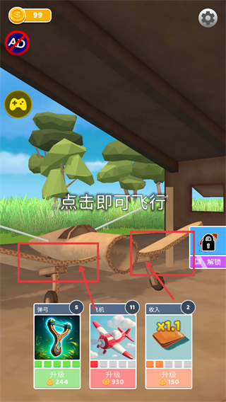 消耗【930】金币将【飞机】升级到11级后,能够解锁飞机的相关部件,界面依旧会显示【点击即可飞行】的提示,点击该提示即可触发飞行功能。