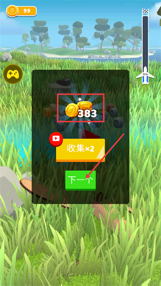 飞行结束后你将得到【383】金币作为奖励,你可以点击【下一个】按钮继续进行飞行,也可以选择观看广告并点击【收集×2】来获得双倍的奖励。