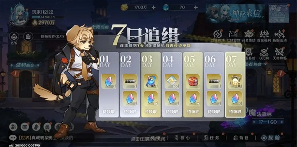 玩家在第七天可免费领取天命英雄【库特斯】,此外还能获得奇遇水晶*15、钻石*2152、许愿石*10等福利;通过获取天命结晶,可轻松兑换奇遇水晶、传说英雄自选、传说装备自选、天命许愿石、许愿石等奖励。