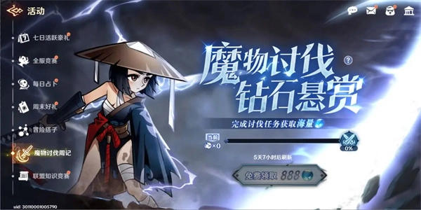 每周都会发布魔物讨伐任务,只要完成该任务,就可以免费领取888钻石。