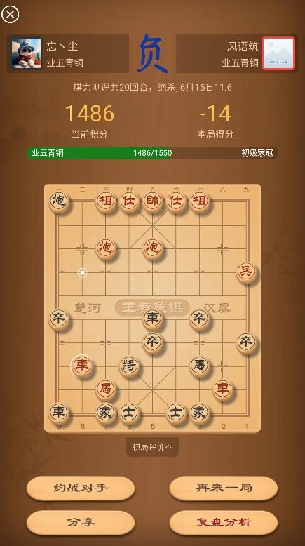 对局结束后即可对你的棋力进行评估。