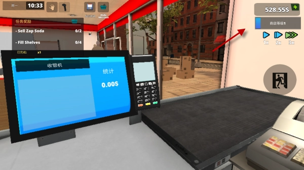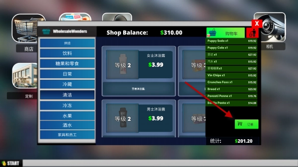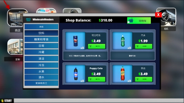 进入超市后,一开始里面是空的,首先得进些货。点击右上角的金钱,再点商店就能开始采购,刚开始选些银两和零食就行。