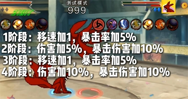 四尾状态下的鸣人在遭受攻击时会逐渐变得愤怒,愤怒程度共分为4个阶段,每个阶段对应着20%的血量降低,具体的对应情况可参照下图: