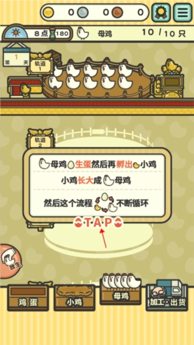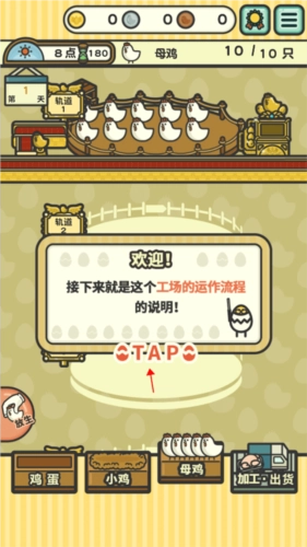 打开游戏后,点击“OK”按钮即可开启游戏之旅。在游戏里,你将被任命为养鸡工厂的老板,接下来需要熟悉整个工厂的运作流程。现在点击“TAP”按钮,继续了解后续的说明内容。