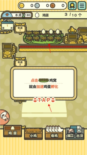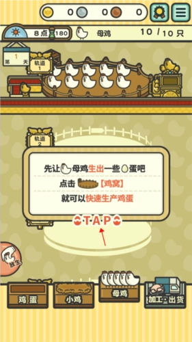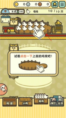 接下来为你介绍具体的操作步骤,首先进行母鸡生蛋的环节,你会看到鸡窝中有不少母鸡,持续点击鸡窝,就能提升鸡蛋的生产速度。