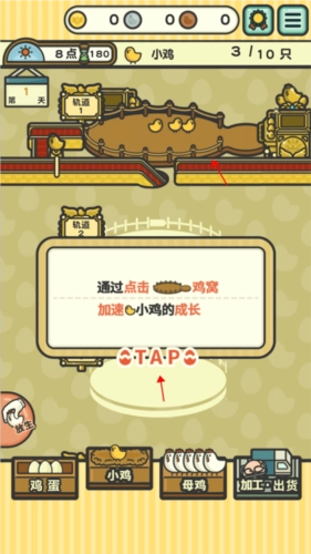 接下来就进入小鸡成长为母鸡的阶段了,依旧是点击鸡窝,让小鸡的成长速度加快。