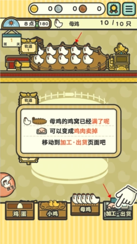 养鸡工厂在18点之后会自动关闭停止营业,并且会展示当天的出货数据,比如母鸡的数量、收入情况等。