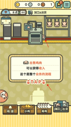 点击下方的“加工·出货”功能,母鸡通过中间的仪器后,会自动生成鸡肉,速度很快。生产出的鸡肉进行售卖,养鸡工厂就能获取收入,这便是整个运作流程。