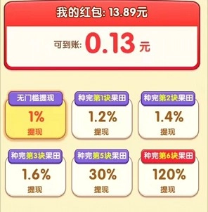 红包的提现比例初始为1%,种完第一块果田后会提升至1.2%,种完第二块果田则能达到1.4%,提现比例越高,实际到账的红包金额也就越多。