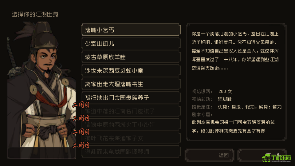 你能够自定义自己的江湖造型,接着点击下一步;4、也可以挑选你的江湖出身,像乞丐、孤儿、放羊娃之类的。