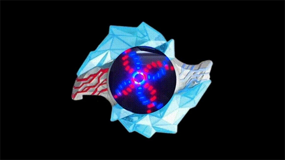 变身时,中间的水晶会展开并露出显示屏,屏幕上会出现红、蓝两色圆圈旋转,不同晶石的特效各有不同。
