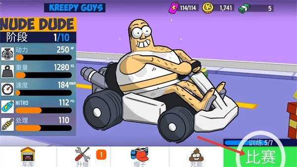 1、先确认【NUDE-DUDE】这个角色的属性情况(比如【速度-184】这类信息),之后点击【比赛】按钮,进入到【训练5/7】的对局当中。