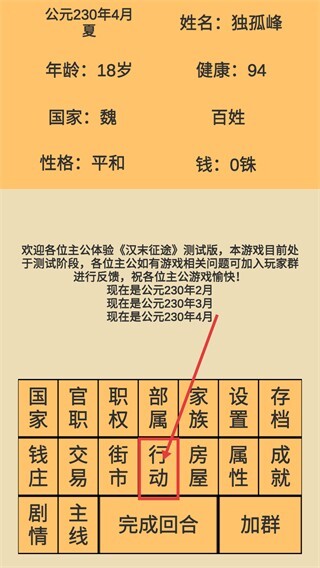 进入游戏后,先查看角色的基础信息,比如18岁、健康值94这类内容,接着点击界面上的【行动】按钮,就能解锁日常行为相关的操作选项了。