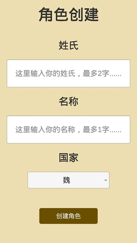 1、进入角色创建界面后,依次选定姓氏为【独孤】、名称为【峰】、国家为【魏】,接着点击【创建角色】按钮,即可完成角色的初始创建流程。