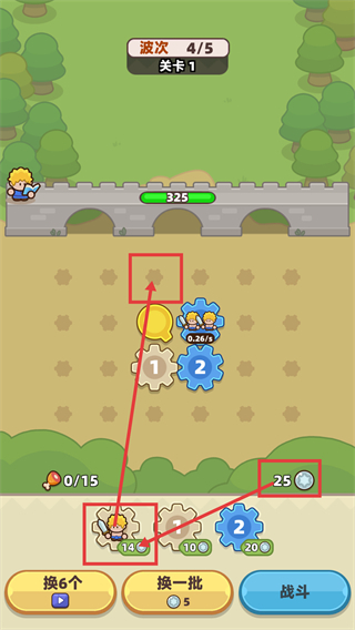 1、当前处于【波次-4/5】【关卡1】阶段,可消耗【14-钻石】兑换对应单位,目前持有【25-钻石】,计划配置单位以开启本波战斗。