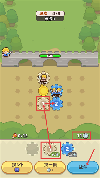 2、在【波次4/5】【关卡1】里,花费【10钻石】兑换【1级单位】后钻石剩余【11】,点击【战斗】按钮推进流程,单位产出效率随之调整。
