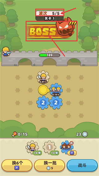 4、进入【波次-5/5】【关卡1】后,会触发【BOSS】战斗,此时城墙剩余血量为【189-】,需要集中所有单位的战力来应对这最终波次的BOSS。