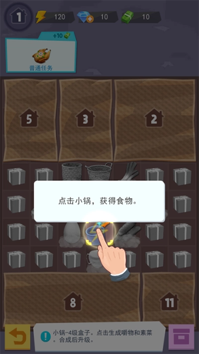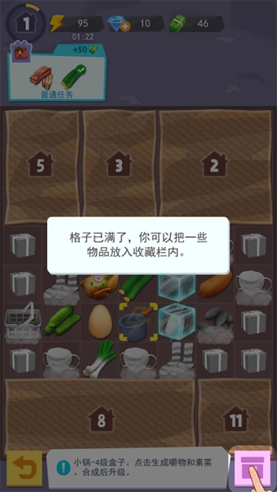 2、进入主线任务后,点击效果按钮获取食物,将获得的食物收集到任务食物框中;此外,相同的食物还能进行合成,升级为更高级的食物。