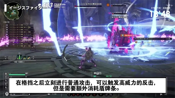 当遭受连续攻击时用盾牌进行防御,盾条会瞬间减少一部分;此外,用盾牌成功格挡敌人后立刻进行普通攻击,就能触发高威力的反击,但触发反击时会额外消耗部分盾条,因此也不能随意频繁使用。