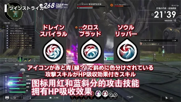 关于HP吸收的技能,除了鼠标右键释放的职业专属动作外,技能图标呈红蓝双色的攻击技能同样附带吸血效果;此外还有一个buff技能,在其生效期间,角色的所有攻击都能实现吸血。