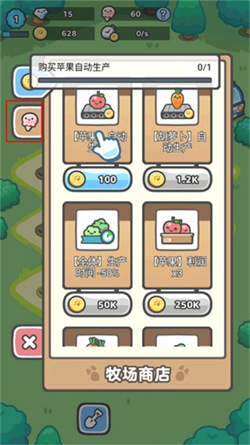 4、点击左上角的牧场商店,用金币购买“苹果自动产生”,也可以选择雪糕、升级指数,以此来获得更多收益。