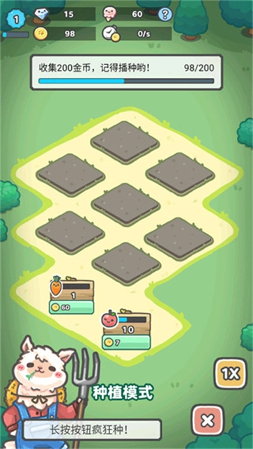 1、在本站安装游戏后打开,先从开垦第一块田开始,挑选你想种植的农作物。等果实成熟,用手指点击或滑动屏幕,就能收割各类农作物了。