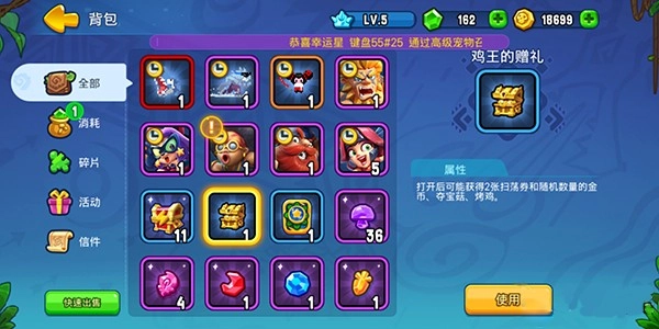 玩家能在背包里查看自己持有的碎片、消耗品等各类道具。这里面的时效宠物和时效英雄虽然只能使用一段时间,但依然能进行英雄觉醒操作。而且下次再使用该英雄时,会继承上次觉醒后的星级,所以玩家完全可以放心培养自己喜欢的英雄!