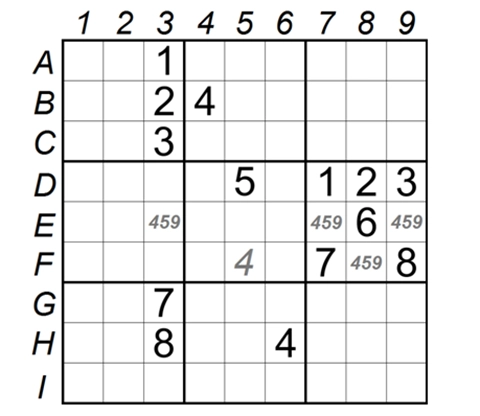 数对占位法是数独解题中的一种实用技巧:当两个数字仅能填入某区域内的两个特定单元格时,即便暂时无法确定这两个数字的具体排列顺序,也可借助这两个单元格的占位效应,排除该区域内其他单元格填入这两个数字的可能性,进而通过排除法逐步推导出其他空格的数字,推动数独题目的解答进程。