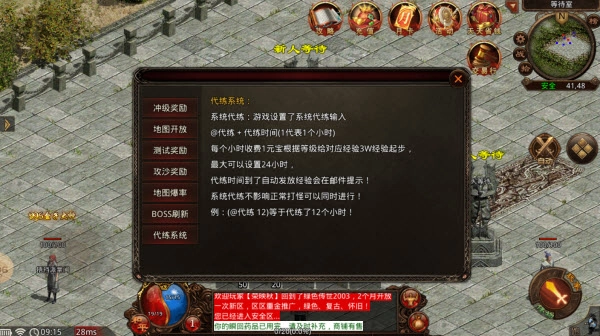 1、系统代练:游戏内设有系统代练功能,操作方式为输入@代练+代练时长(数字1对应1小时),收费标准为每小时1元宝,系统会依据角色等级发放相应经验,经验值最低3W起,代练时长最多可设置为24小时。