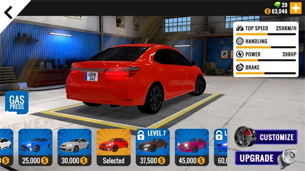 7、在主界面点击GARAGE按钮即可进入车库,在这里你能解锁全新车辆,还能对已拥有的车辆进行改装与升级操作。