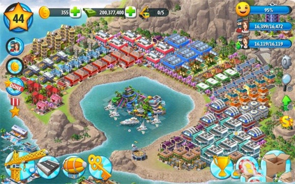 5、建造优先级排序为:快乐值>居民>职员。要尽量多建造建筑来获取更多利润。我每次收获大概能有500万金币,现在总资产已经到2亿了,居民数量有16000名,不过买一块地皮还是得花差不多3000万金币。
