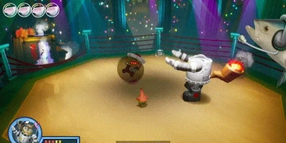 机械珊迪的生命值达到了9点,它会运用坐坐/抱抱以及空手道的方式对小海绵发起攻击。