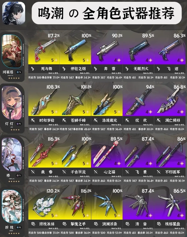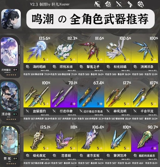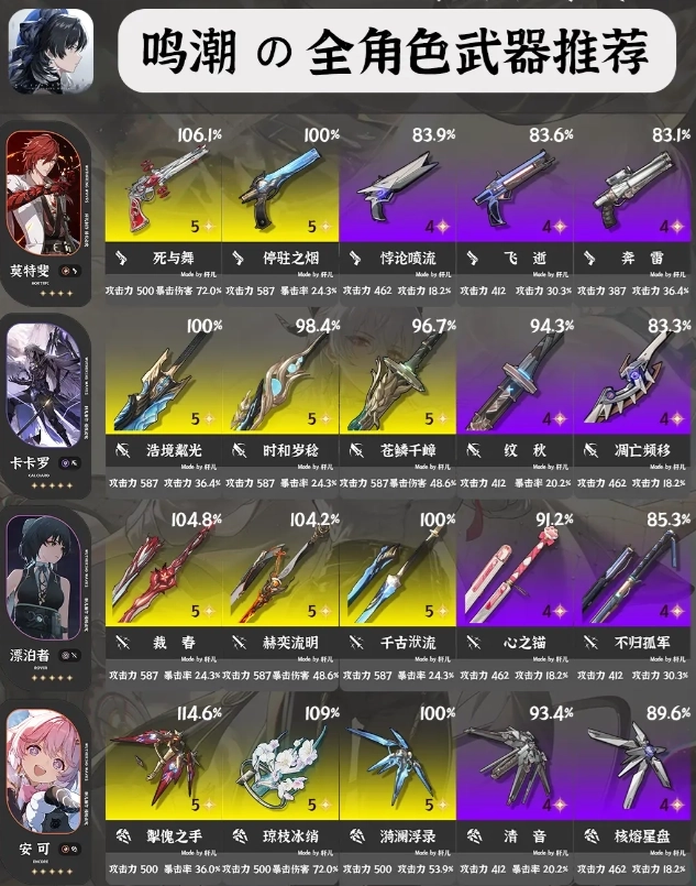 ①每位角色推荐5把武器,按照优先级排序
