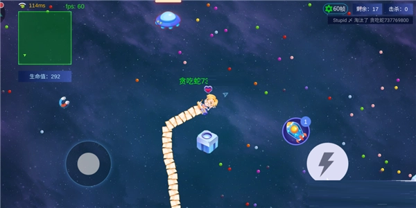 操控摇杆来控制你的小蛇移动,吃掉地图上那些彩色的小圆点,小蛇就会变得更长。
