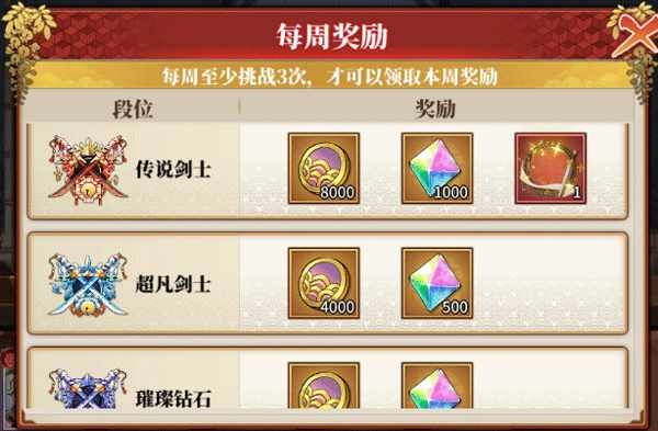 每周奖励采用循环机制,当新赛季开启且段位重置时,上一赛季参与挑战次数达到3次及以上的玩家,可前往玩法界面领取该奖励。