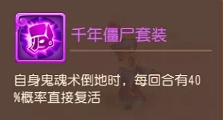 千年僵尸的专属套装可使具备鬼魂或高级鬼魂技能的僵尸,在倒地后每回合都有40%的概率直接复活。