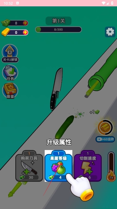 玩家完成特定等级的挑战或指定任务后,就能获取经验值与金币奖励。当这些资源积累到一定数量时,他们便可前往游戏内的商店,选购性能更出色的厨刀,以此提升食材切割时的速度与精准度。此外,随着厨房等级的提升,还会解锁全新的切割特效,为玩家带来更丰富的视觉体验。