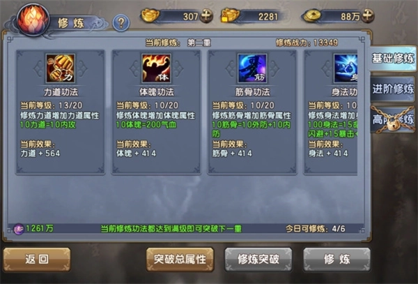 修炼体系划分为三个类别,分别是基础修炼、进阶修炼和高阶修炼。在这三个类别的修炼中,各自都包含着若干个小功法。一旦这些小功法修炼到顶级,就能通过突破来获取更强大的属性加成,并且还会解锁小功法的更高等级。此外,这三个类别的修炼也能够通过突破来逐步开启。