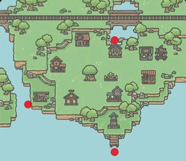 2、这些钓鱼点会随游戏天数的推进逐步解锁。到水边点击对应的标志就能开始钓鱼,如果没看到标志,那是因为你还没有鱼竿,得赶紧去购买!