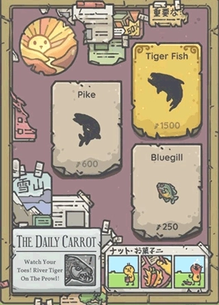 3、鱼可以分为两类,一类是常见的鱼,另一类是特殊的鱼。特殊的鱼会在特定的时间和地点出现,大家要多留意村里布告栏上张贴的报纸信息。