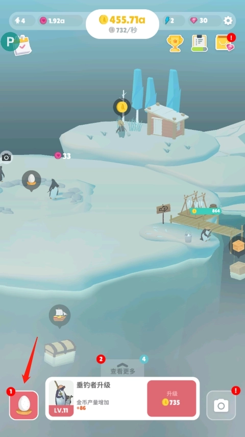 1、当积累到足够的金币后,就能得到一颗企鹅蛋,这时点击左下角的企鹅蛋即可。