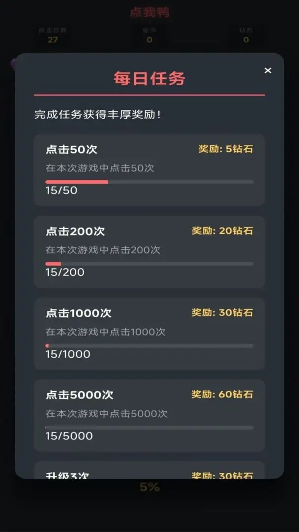 2、游戏里设计了多种多样的每日任务,比如完成特定次数的点击操作、进行角色或技能升级、触发暴击效果以及赚取一定数量的金币等,只要完成这些任务就能得到丰厚的金币奖励。成就系统同样是游戏的一大特色,玩家可以通过积累点击次数来达成不同阶段的成就,例如“点击新手”“点击熟手”“点击大师”等,并且能获得对应的金币奖励。