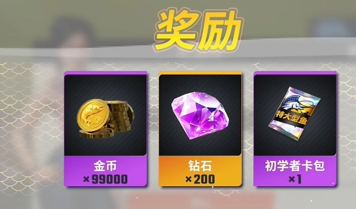 兑换奖励:金币188000枚、钻石300颗、中级卡包1个、终极钓箱(金箱子)1个