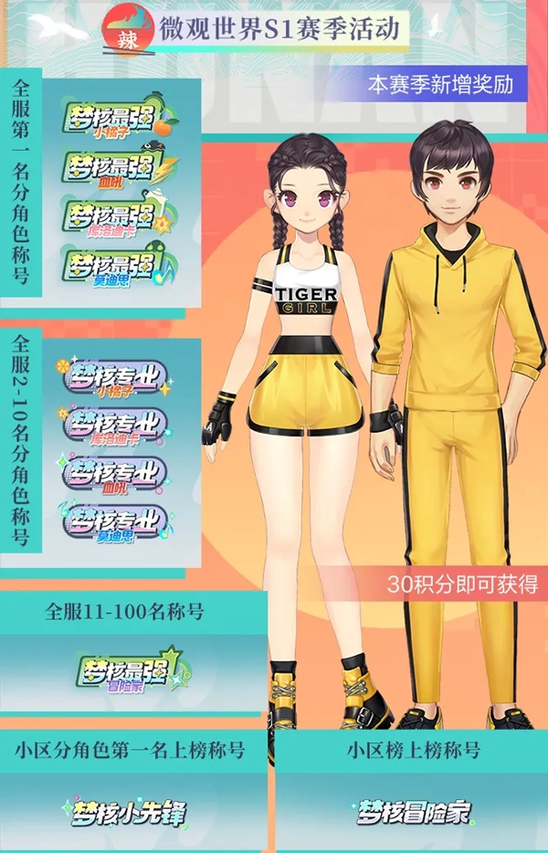 8月26日上午10点,车手们将迎来微观世界全新S1赛季的畅玩时刻!新赛季对机制进行了全面优化,上赛季的白金特权卡与剩余晶钻都能直接继承,帮助车手们实现新赛季的无缝衔接,轻松开启全新的竞速征程~此外,还有专属赛季套装“擂台拳王”、橘子大厅背景道具(30天)、动态头像(30天)以及专属称号等丰厚奖励等待大家领取~